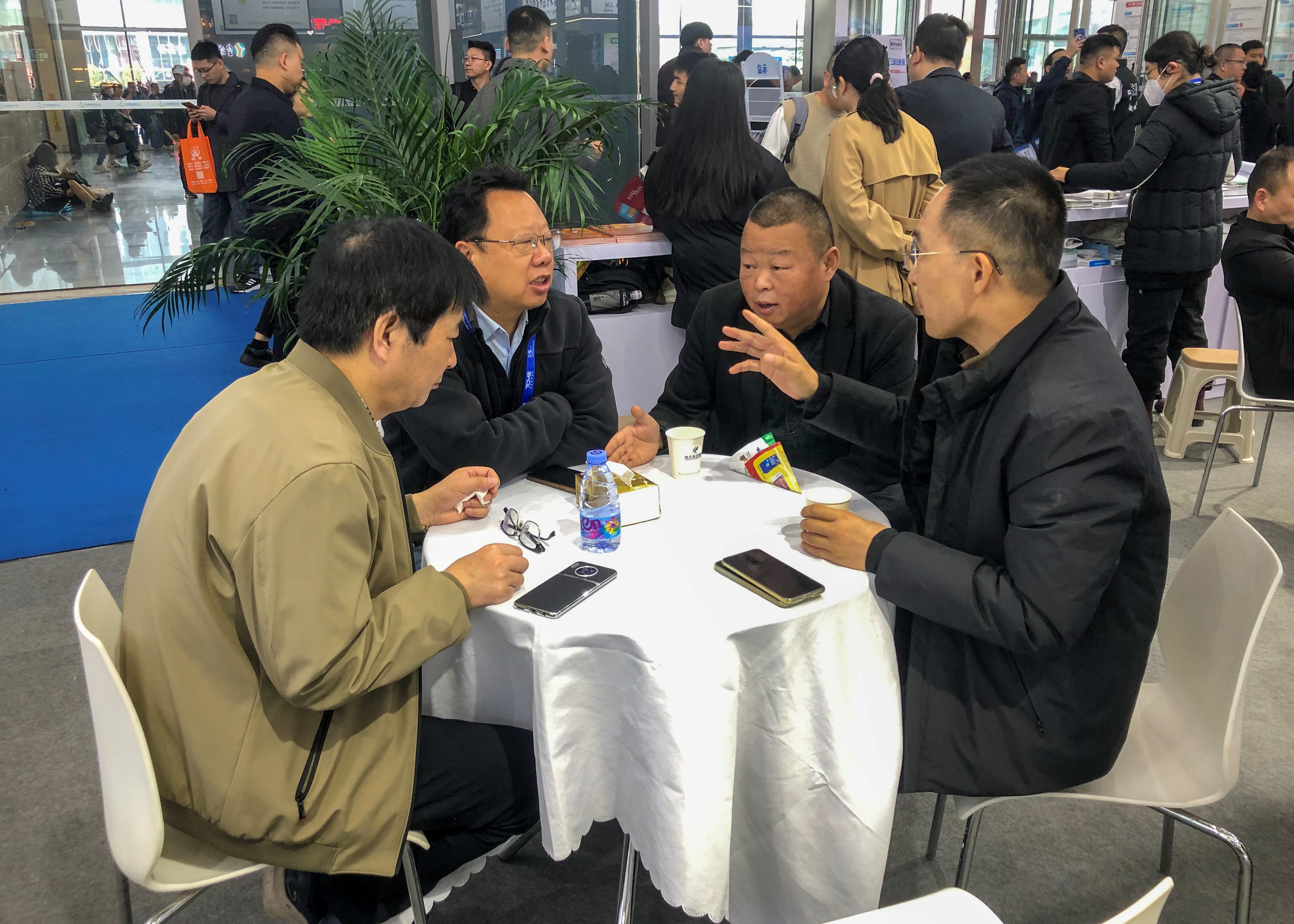 图为:集团董事长蔡翔(右一)与合作伙伴交流