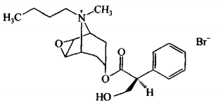 本品主要成份为丁溴东莨菪碱,化学名称为:6β,7β-环氧-3α-羟基-8-丁基-1αH ,5αH-托烷(一)-托品酸酯。
